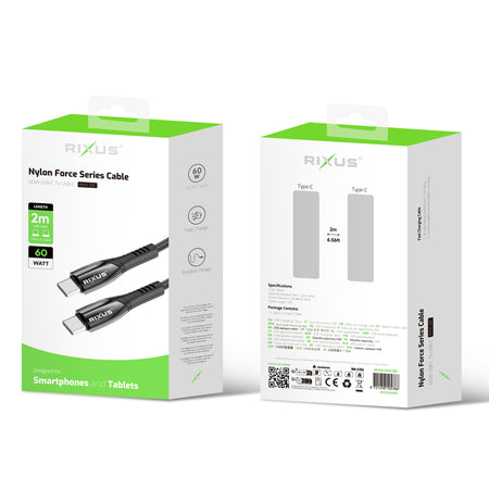 Rixus RXUC38C Fast Charging Cable USB-C To USB-C Braided Nylon 200CM Black