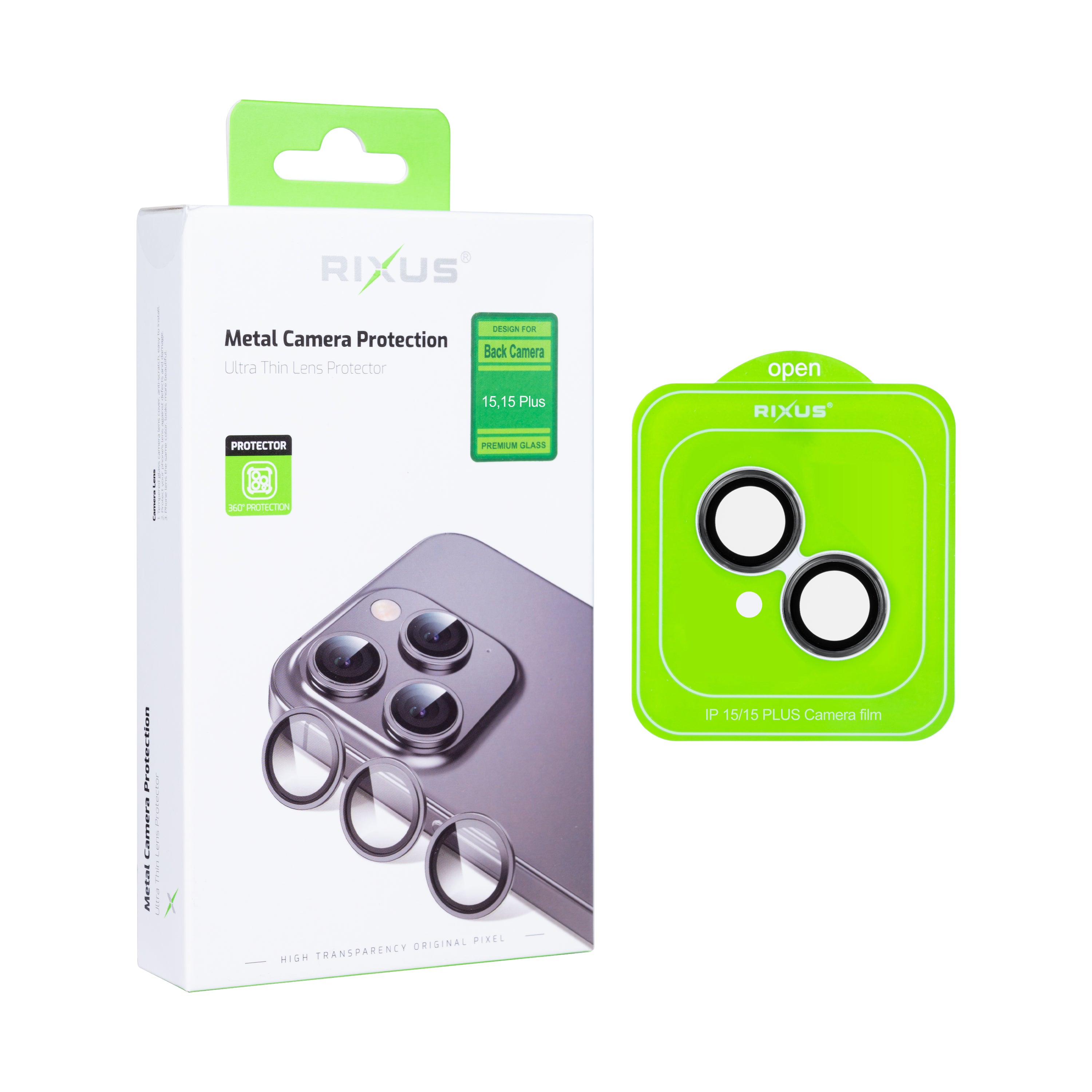Rixus For iPhone 15, 15 Plus Metal Shield Camera Tempered Glass Black
