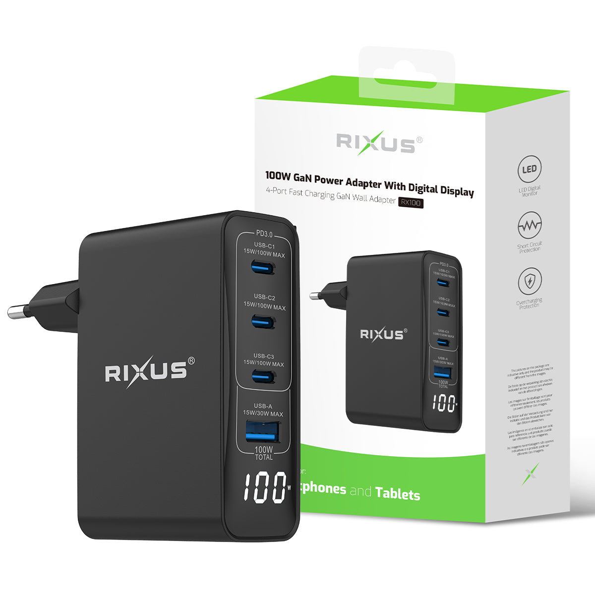 Rixus RX100 100W GaN Power Adapter With Digital Display Black
