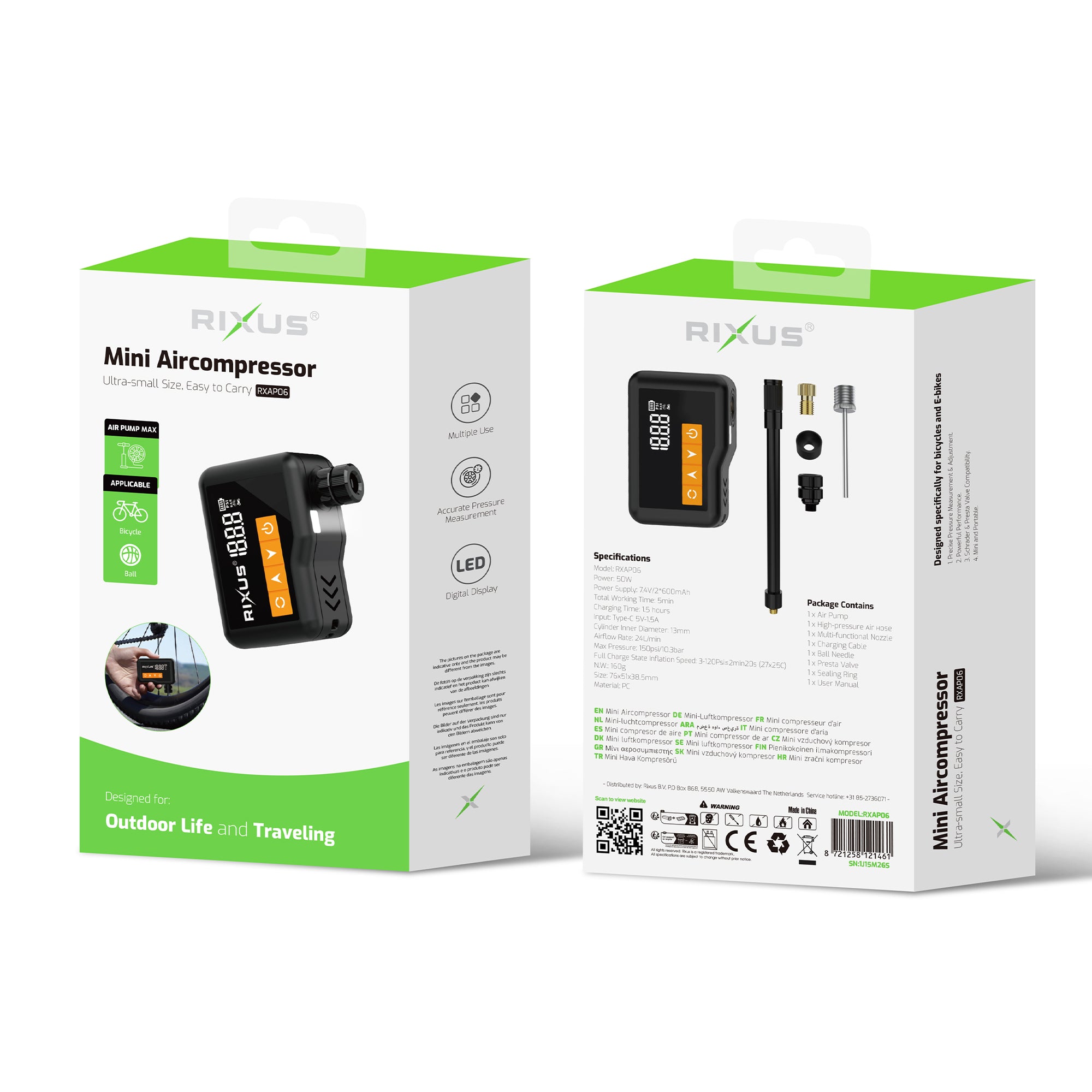1 x Mini air compressor 1 x Hose 1 x Nozzle 1 x Ball needle 1 x Presta valve 1 x Sealing ring 1 x Charging cable 1 x User manual |
