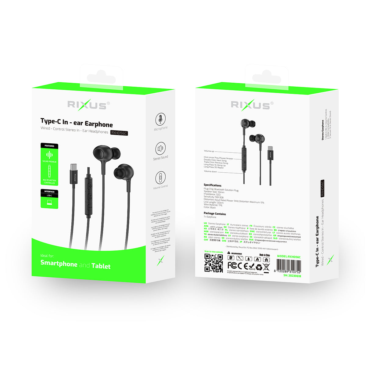Rixus RXHD56C USB-C Wired Earbud With Microphone Black