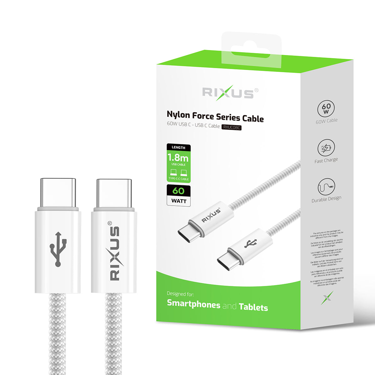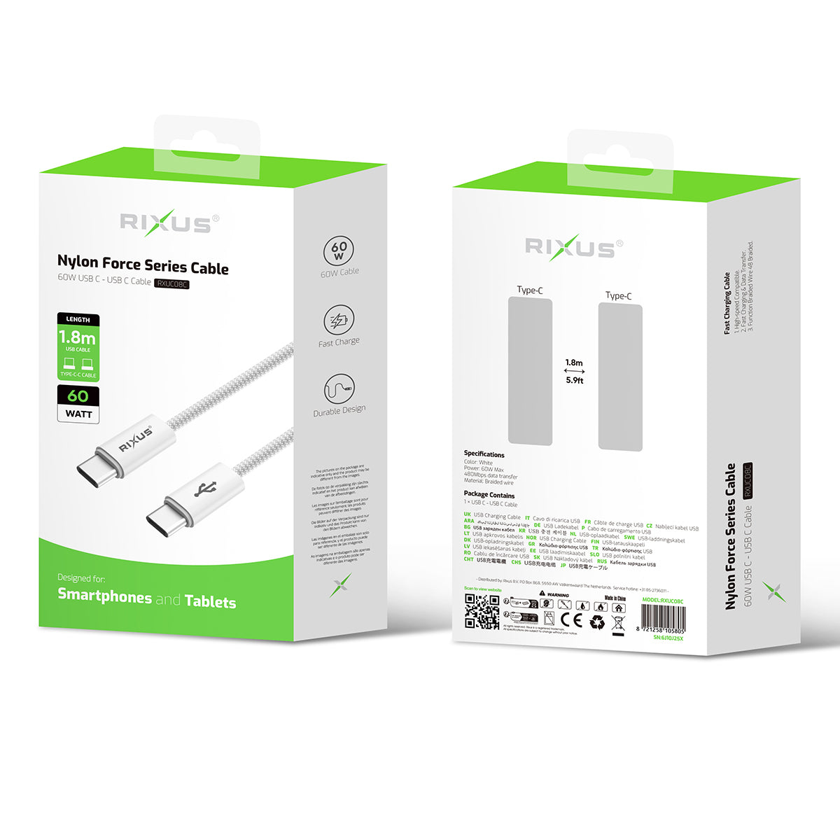Rixus RXUC08C Fast Charging Cable USB-C To USB-C Cable Braided Nylon 1.8m White