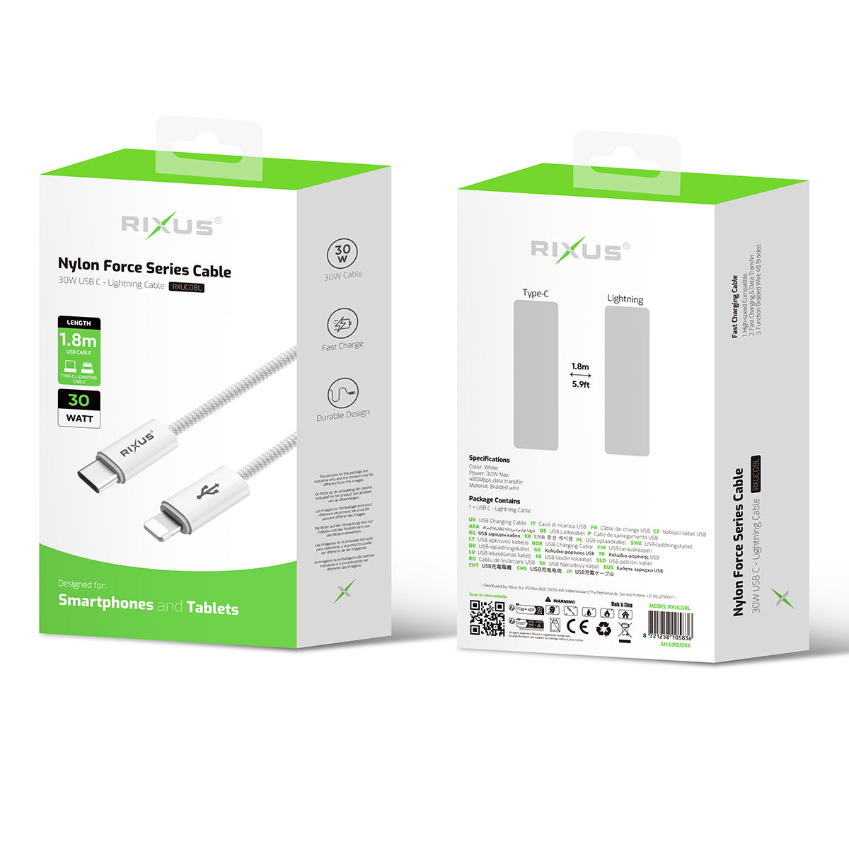 Rixus RXUC08L Fast Charging Cable USB-C To Lightning Cable Braided Nylon 1.8m White