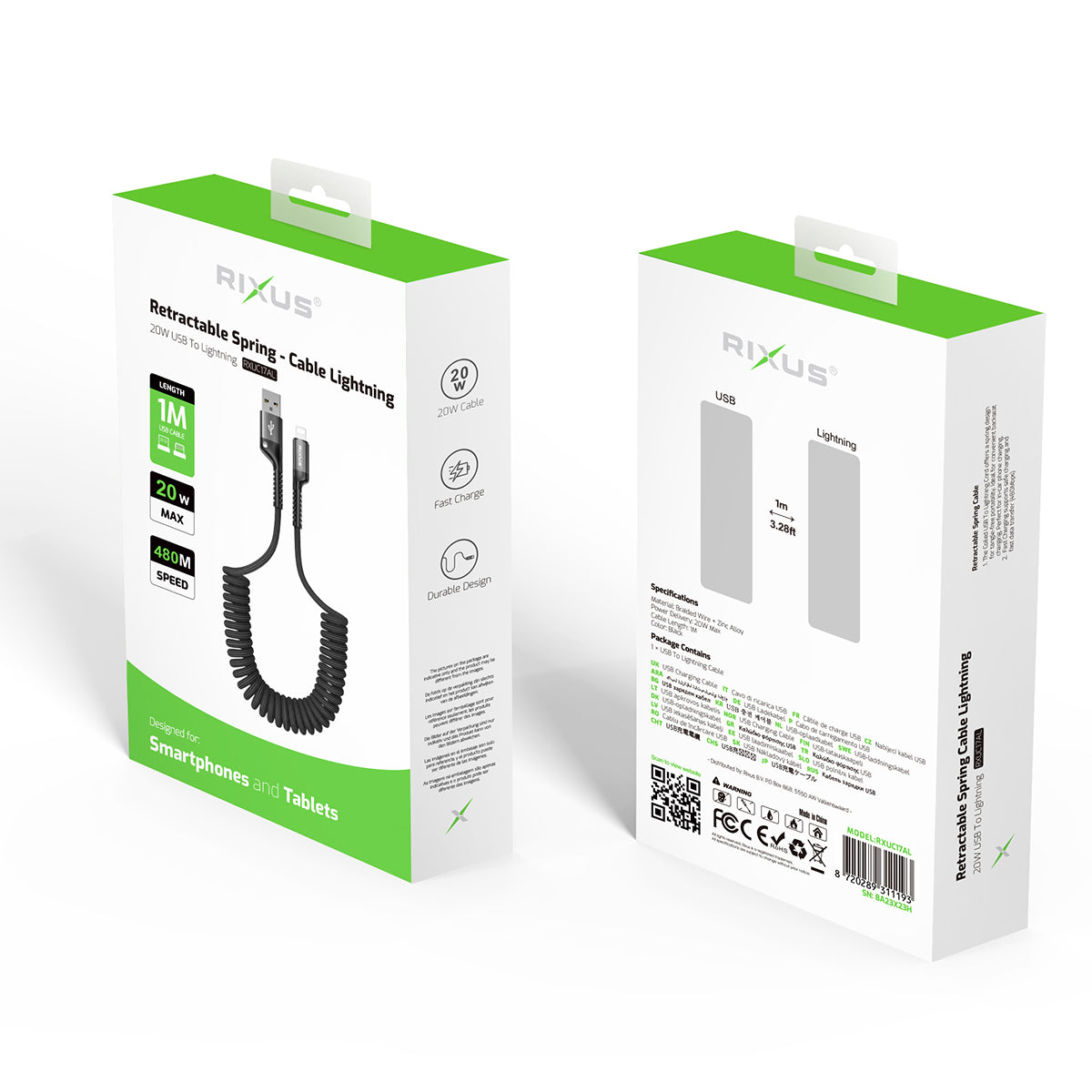 Rixus RXUC17AL Retractable Spring Cable USB-A To Lightning Black