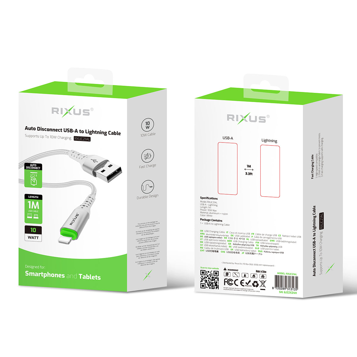 Rixus RXUC21AL Auto Disconnect USB-A To Lightning Cable White. With Automatic Power-Off Function, 10W