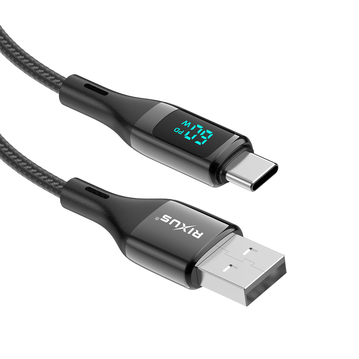 Rixus RXUC28AC Braided USB To USB-C Cable With LED Display 100CM Black