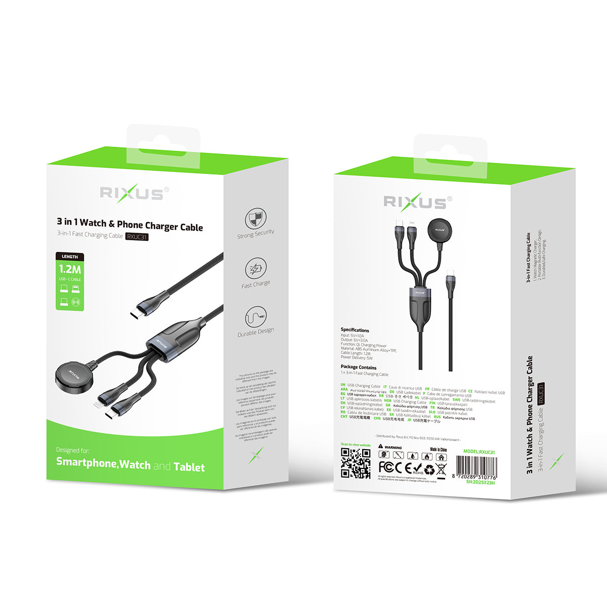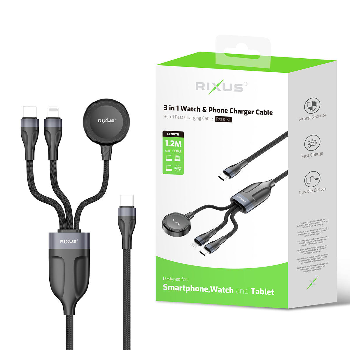 Rixus RXUC31 3 in 1 Watch And Phone Charger Cable 1.2m Black